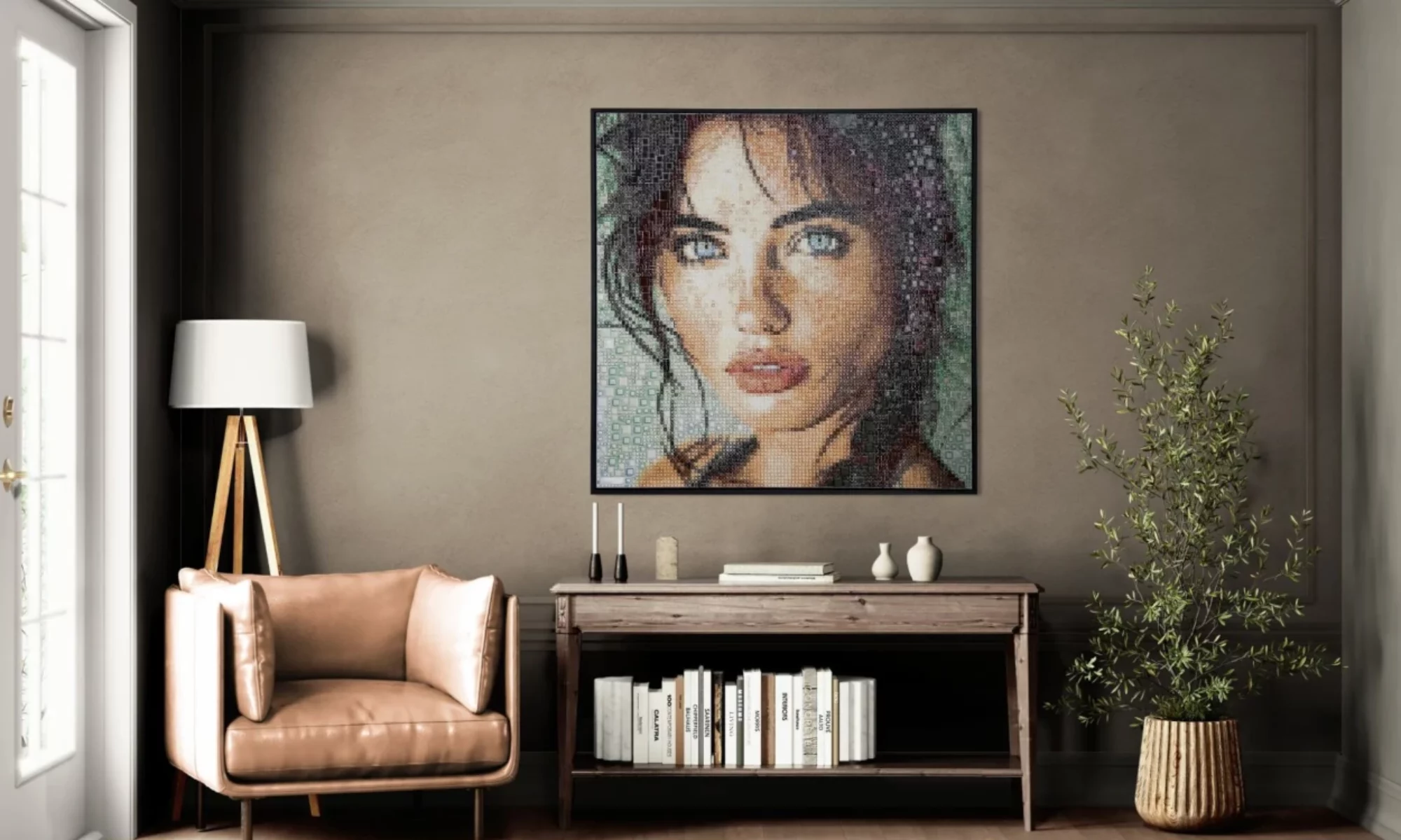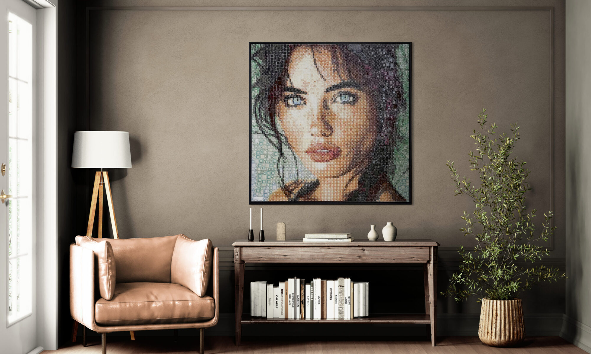 Net als penseelstreken van verf vormen deze levendige glas pixels van dichtbij een abstract patroon, dat vanop afstand transformeert in verbluffende mozaïekportretten. Tessa’s kunst toont de veelzijdigheid van glas als medium. Haar werken sprankelen vaak van kleur of omarmen net subtiele neutraliteit, maar altijd in harmonie met het beoogde interieur terwijl ze balans behouden. Elk stuk begint met een inspirerend beeld, vaak door Tessa versterkt met filters of AI om het een onderscheidend karakter te geven. Ze stemt haar creaties af op de voorkeuren van klanten, waarbij ze interieurkleuren, onderwerpen of specifieke afmetingen naar wens integreert.